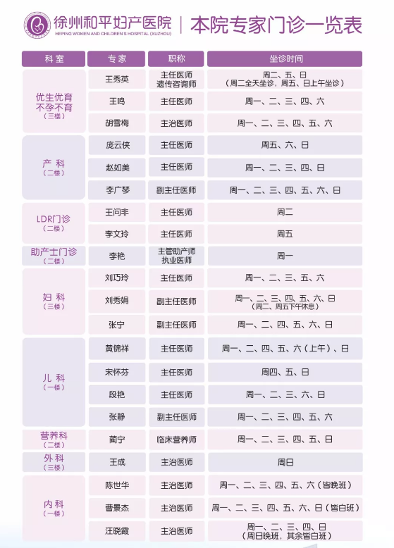 徐州和平妇产医院2019年8月26日—9月1日专家坐诊时间表,有需要的亲,赶紧预约哦~~